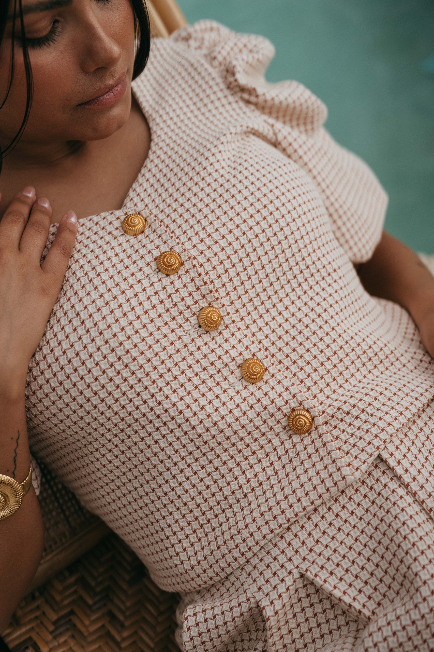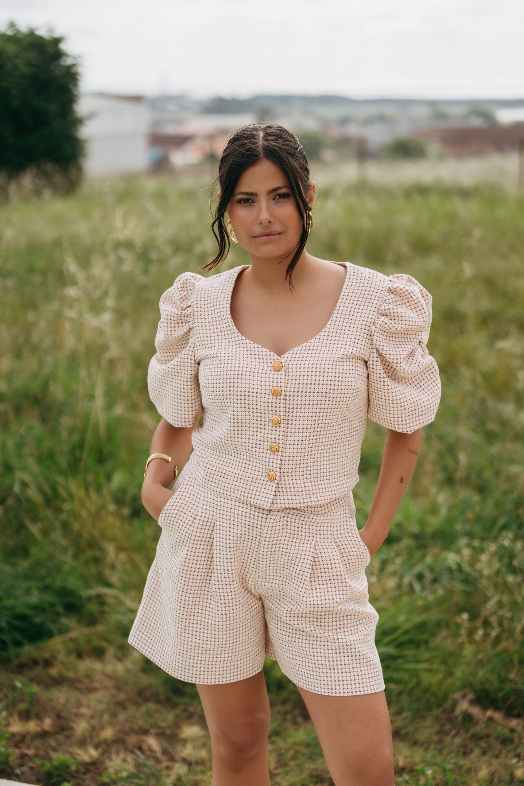 Top com mangas curtas e decote coração. Detalhe de botões dourados em formato búzio. Mangas estruturadas. Confecionado em tecido 100% algodão, com tonalidade creme e terracota.
